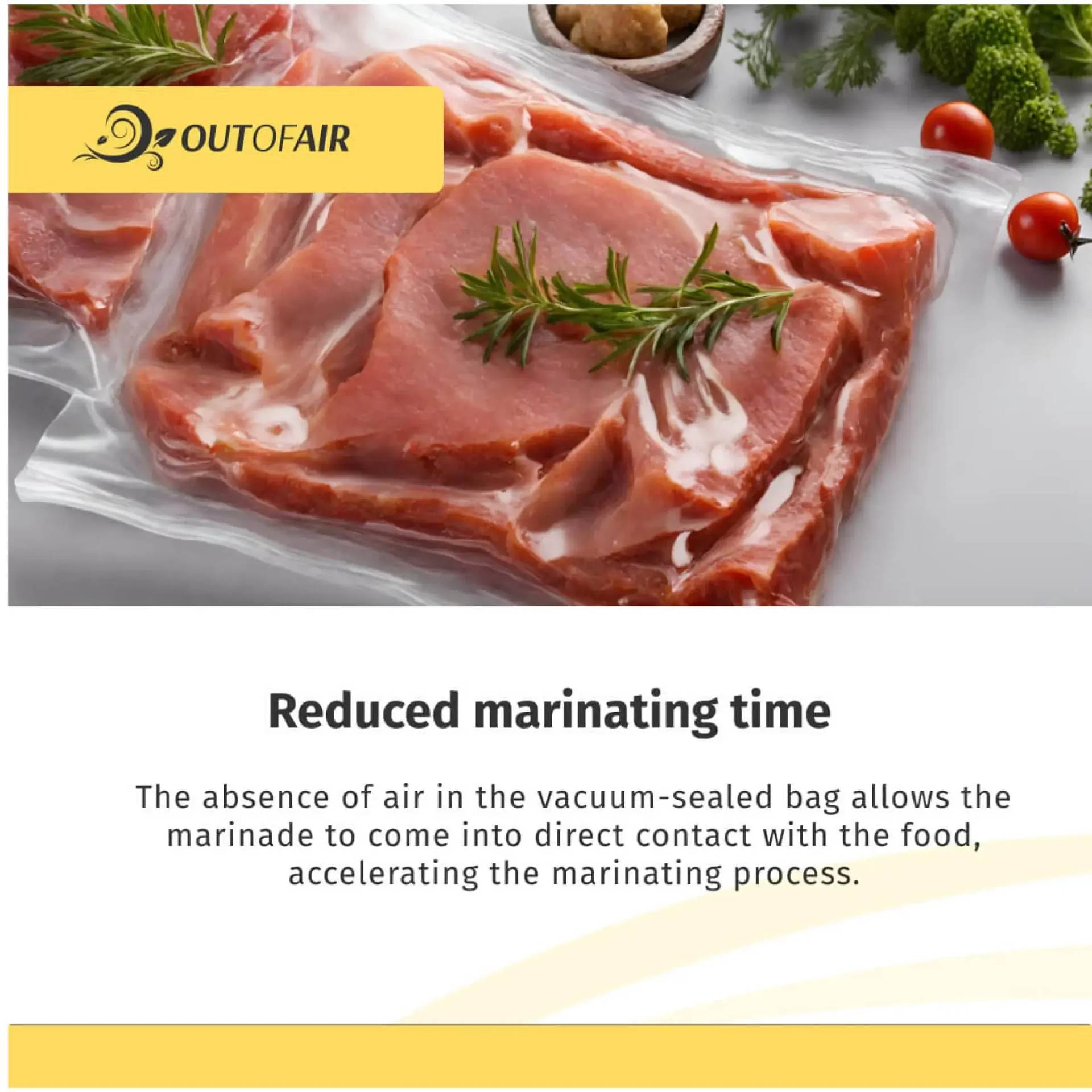 Using OutOfAir vacuum sealer bags to vacuum seal your meat products extends their freshness when refrigerated, ensures food safety, minimizes waste, and saves you money.